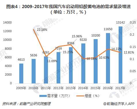 图表4:2009-2017年我国汽车启动用铅酸蓄电池的需求量及增速(单位:万只,%)