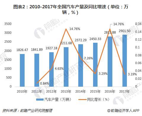 图表2:2010-2017年全国汽车产量及同比增速(单位:万辆,%)
