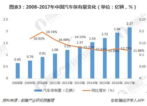 图表3:2008-2017年中国汽车保有量变化(单位:亿辆,%)